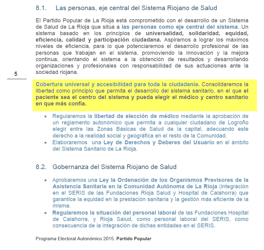 En este sentido, el Partido Popular de La Rioja recuerda que la implantación de la libre elección de médico y de centro era una de las propuestas recogidas en el Programa Electoral con el que el Partido Popular concurrió a las Elecciones Autonómicas de mayo de 2015.