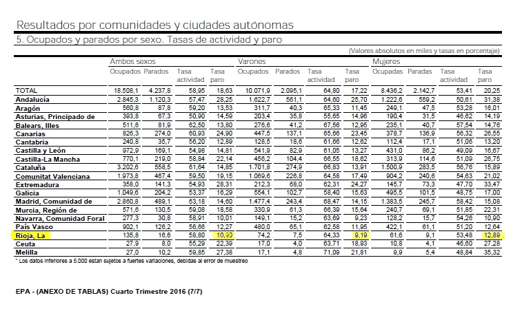 La Rioja cierra el año 2016 con 4.900 parados menos, lo que supone un descenso interanual del 22,71%, más del doble del registrado en el conjunto del país, según los datos de la Encuesta de Población Activa (EPA) correspondientes al cuarto trimestre de 2016 facilitados hoy, día 26, por el Instituto Nacional de Estadística (INE).