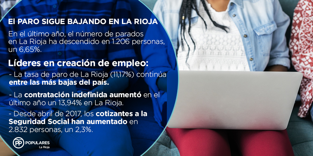Para el Partido Popular de La Rioja, la positiva evolución del mercado laboral en nuestra comunidad, que sitúa a nuestra región a la cabeza de la creación de empleo supone un éxito compartido por todos los riojanos. En este sentido, frente a quienes se empeñan en negar la evidencia y en dibujar sombríos panoramas sobre la economía riojana, la realidad es que, gracias al compromiso de los empresarios, autónomos y el conjunto de trabajadores, La Rioja sigue siendo, con las políticas del Partido Popular, una referencia nacional en creación de empleo.