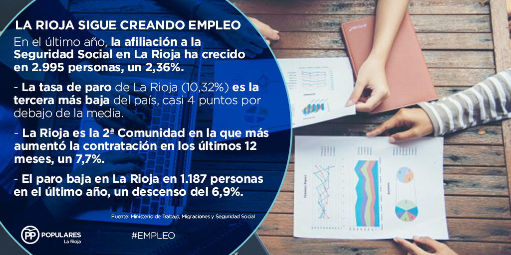 A la vista de estos datos, el Partido Popular de La Rioja reitera su confianza en la fortaleza de la economía regional y en su capacidad para seguir creando empleo, cada vez más estable y de mayor calidad. En este sentido, el descenso interanual del desempleo, el incremento interanual de la contratación y el aumento en el número de afiliados en el último año son el mejor estímulo para continuar trabajando para ofrecer más oportunidades de empleo a los riojanos.