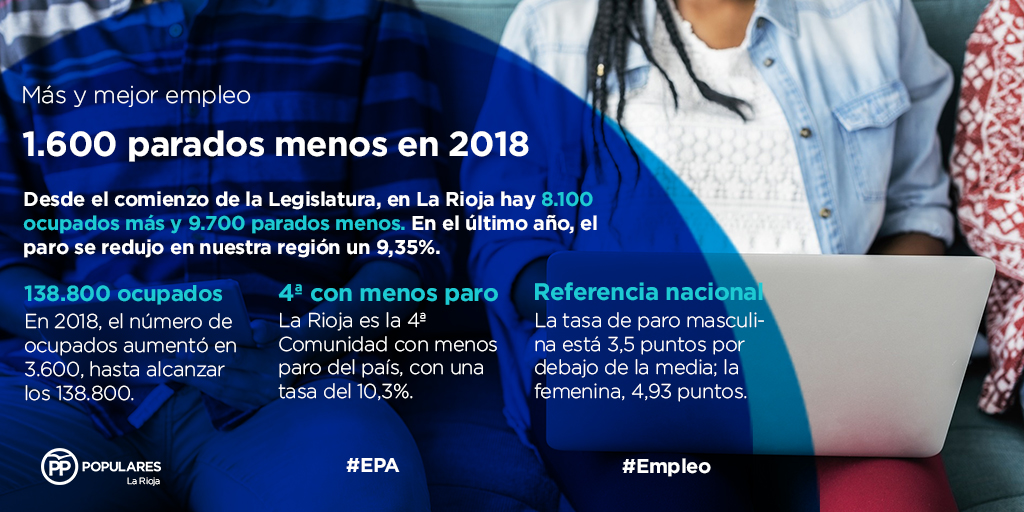 Los buenos datos conocidos hoy evidencian el dinamismo de la economía regional y su capacidad para continuar creando empleo, cada vez más estable y de mayor calidad. Así, desde el comienzo de la Legislatura, en nuestra región hay 8.100 ocupados más y 9.700 parados menos. Una positiva evolución que para el Partido Popular de La Rioja supone el mejor acicate posible para seguir impulsando políticas que ofrezcan más oportunidades a los riojanos.