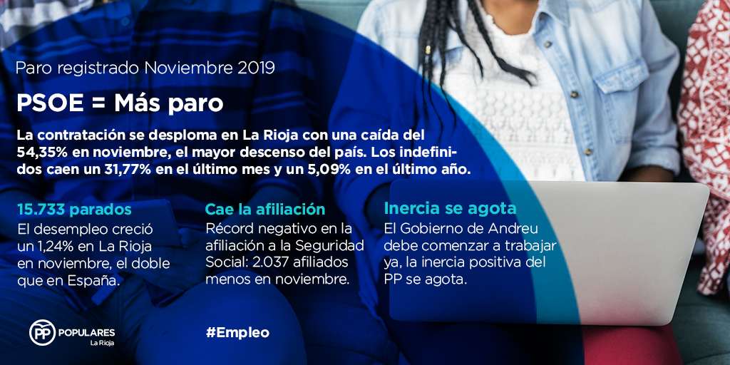 La inacción del Gobierno de La Rioja en materia de empleo está frenando la inercia. La herencia de las políticas populares se agota y es el momento de gobernar para garantizar que La Rioja continúe siendo una referencia nacional en creación de empleo estable y de calidad y no una Comunidad más gobernada por el PSOE a la cola de todas las estadísticas.