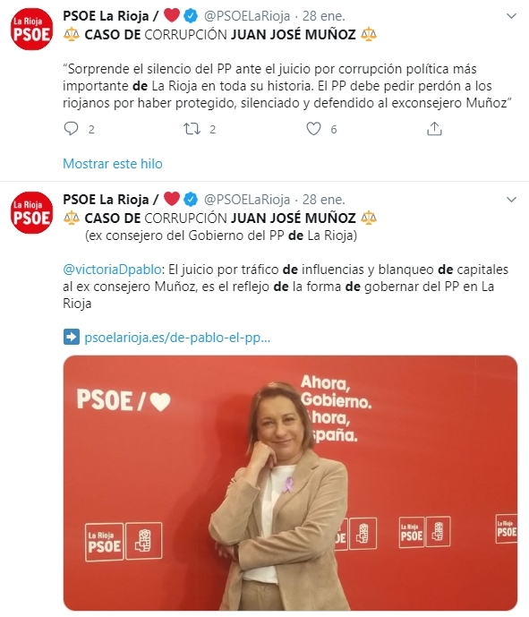 Otra de las dirigentes socialistas más activas en este asunto ha sido la Secretaria de Justicia del PSOE de La Rioja y Senadora, Victoria de Pablo, que en enero de 2020, reclamó al PP que “pida perdón a los riojanos ante el juicio por corrupción más grave de la historia de La Rioja”.