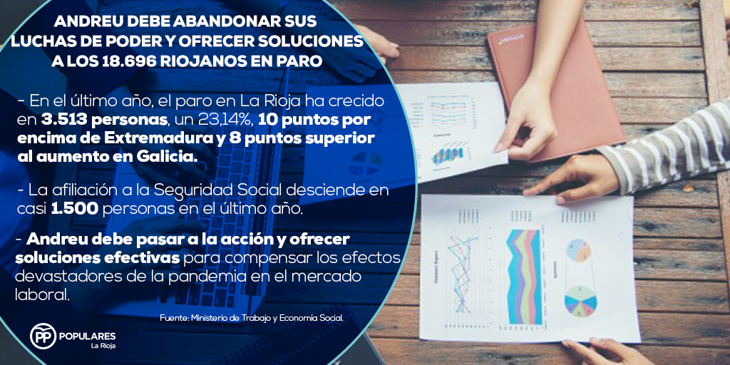 A la vista de los datos facilitados hoy, día 2, por el Ministerio de Trabajo y Economía Social, el Partido Popular de La Rioja exige a Concha Andreu que abandone sus luchas de poder y trabaje de manera inmediata para ofrecer oportunidades a los 18.696 riojanos en situación de desempleo, la cifra más alta en un mes de agosto desde el año 2015, a los que se suman los 3.681 riojanos en ERTE a fecha 31 de agosto.