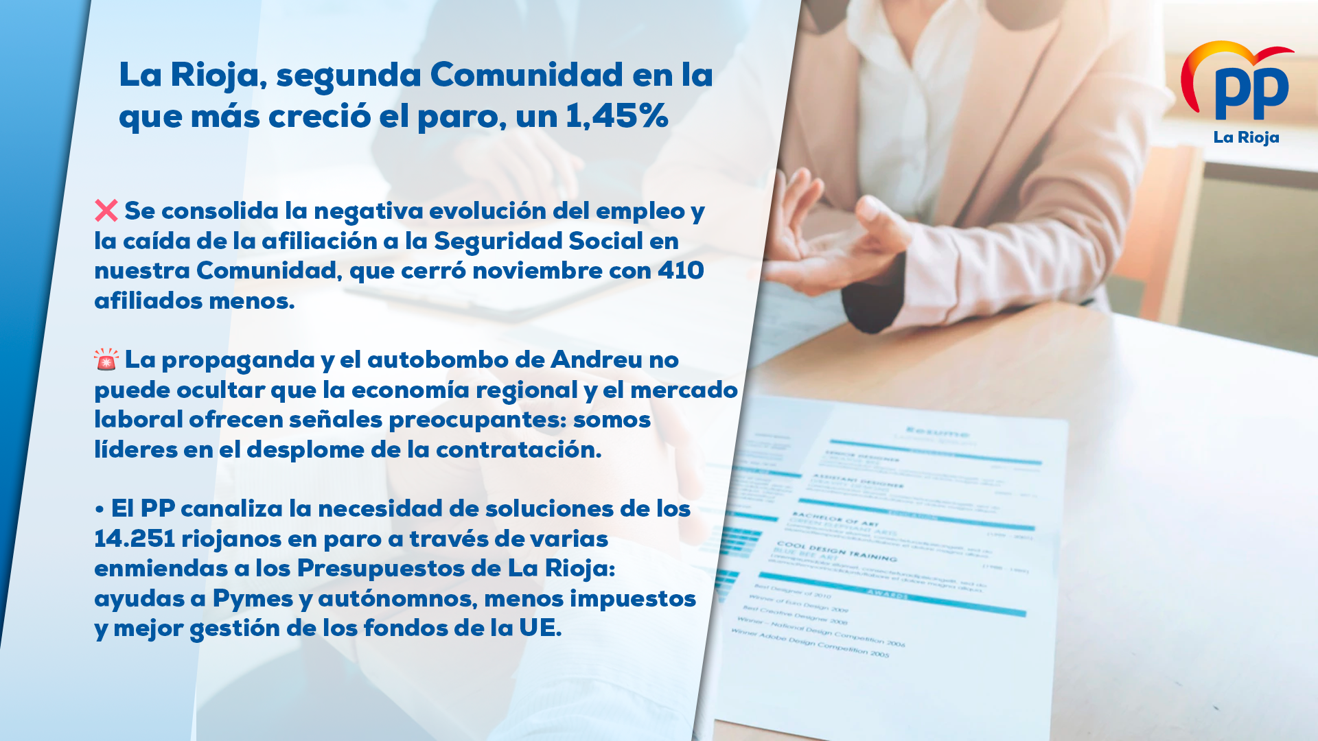 14.251 riojanos en paro demandan al Ejecutivo de Andreu soluciones. Ante la incapacidad manifiesta del Gobierno de Andreu para ofrecerlas, el Partido Popular ha plasmado esas soluciones en forma de enmiendas a los Presupuestos de La Rioja para 2023 que se debatirán próximamente en la Cámara Regional. Enmiendas dirigidas a apoyar a Pymes y autónomos, a reducir la presión fiscal a empresas y familias o a gestionar de manera eficaz los fondos europeos para que contribuyan de verdad a reactivar la economía.